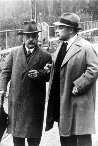 Wolfgang Pauli y su antiguo profesor Arnold Sommerfeld asistiendo a una conferencia sobre la teoría electrónica de los metales en Ginebra. Ginebra, 15 de octubre de 1934. Créditos: CERN