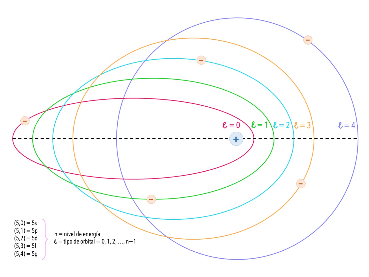 Figura 1. Órbitas posibles para el electrón en el nivel 5: la excentricidad está dada por los dos números cuánticos n y l (adaptado de Sommerfeld 1916a).