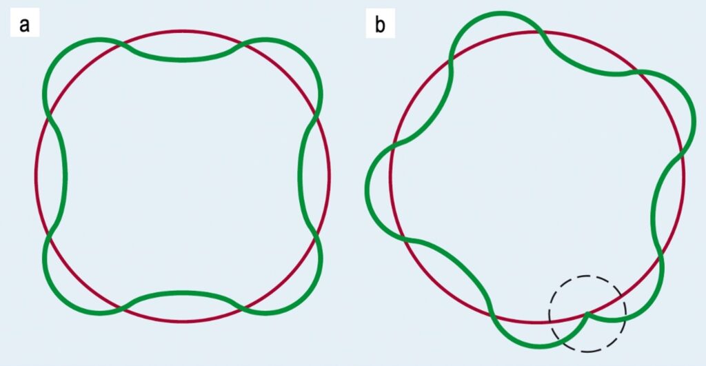 Figura 2. La circunferencia de la órbita es igual a un número natural de la longitud de onda: (a) órbita permitida y (b) órbita no permitida (Chang 2006).