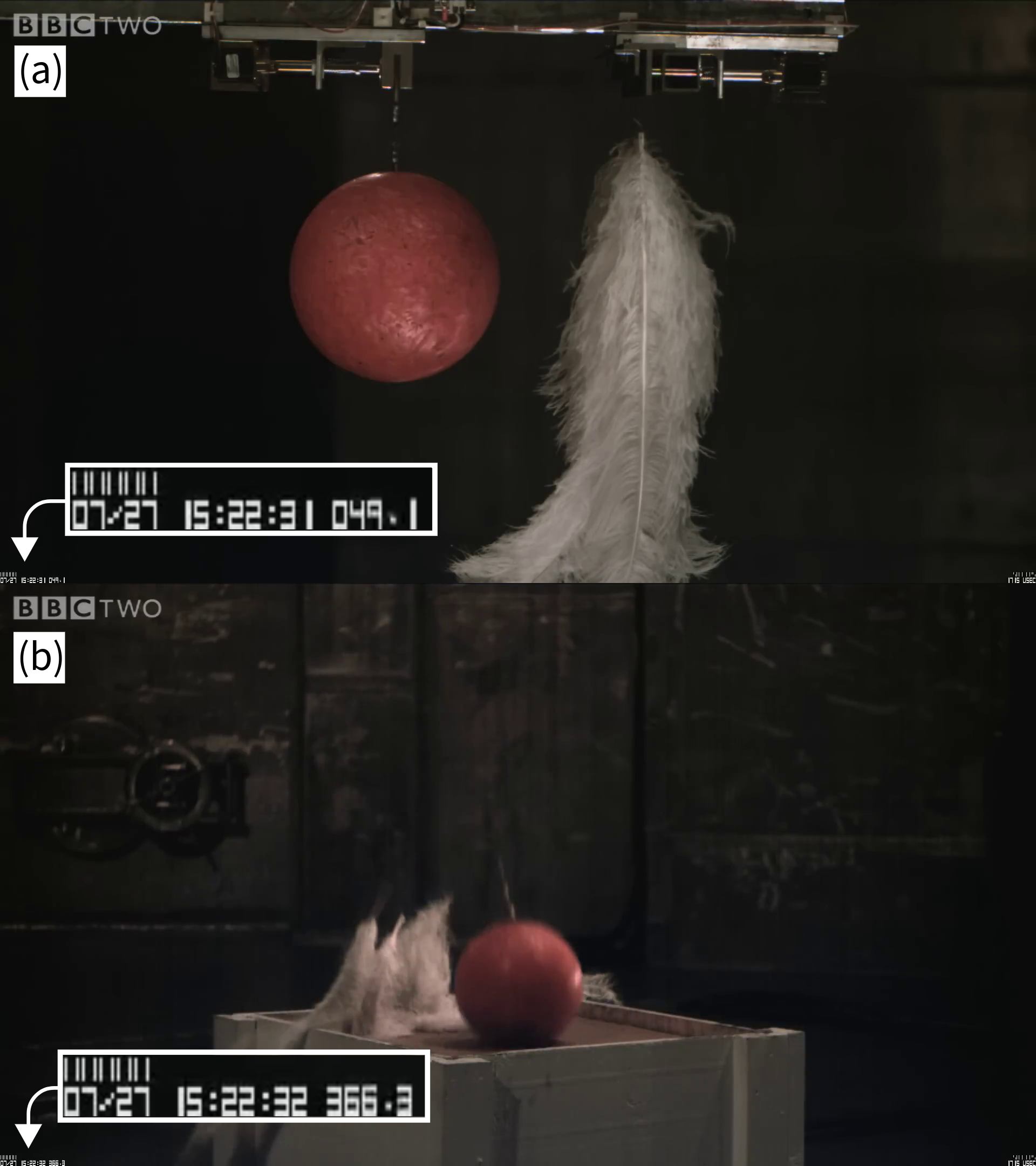Ensayo de caída libre con aire y en vacío, para comprobar las ecuaciones de la cinemática por Brian Cox en el cuarto episodio de la primera temperada, titulado Un lugar en el espacio y el tiempo, de su programa de la BBC Universo humano (BBC).