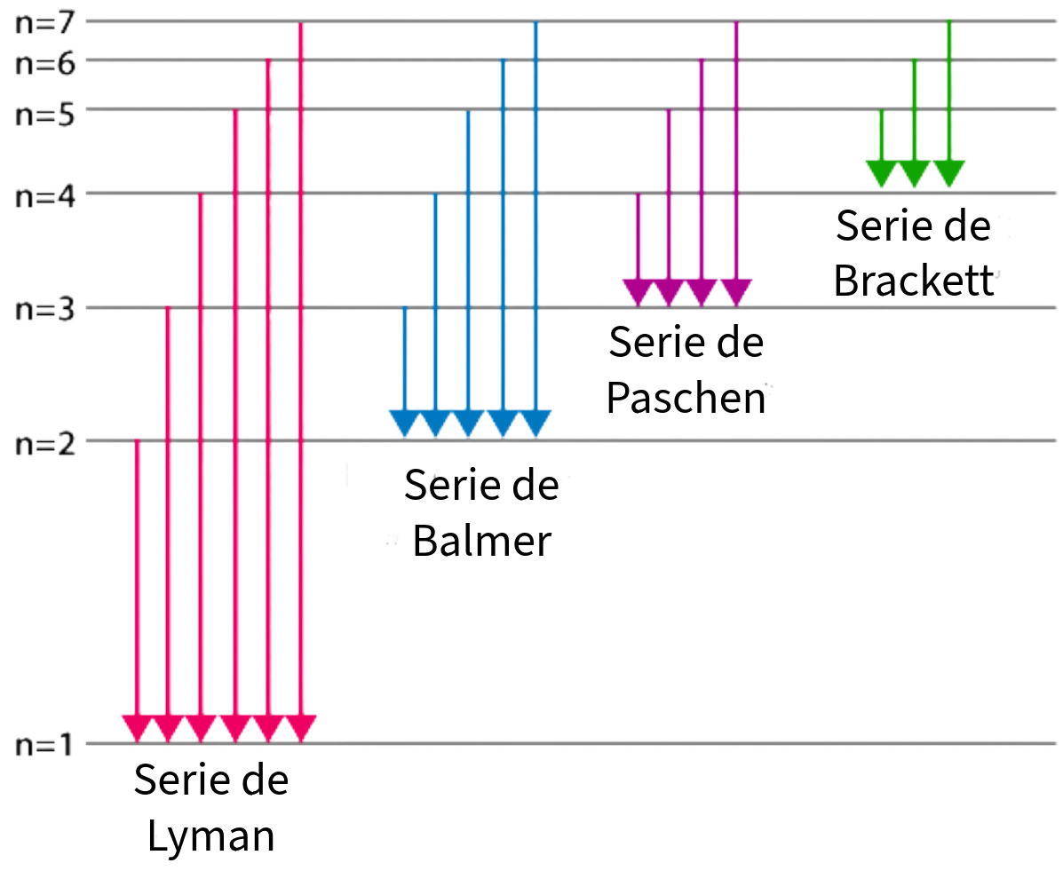 Esta transición ocurre cuando un electrón excitado pasa de un estado de mayor energía a uno de menor energía, o lo que es lo mismo, de un nivel superior a otro inferior (Figura 2). Existen muchas transiciones electrónicas posibles, y cada una presenta una diferencia de energía específica, como la serie de Balmer (1885), la de Lyman (1906), la de Paschen (1908), la de Brackett (1922), la de Pfund (1924) y la de Humphreys (1953).