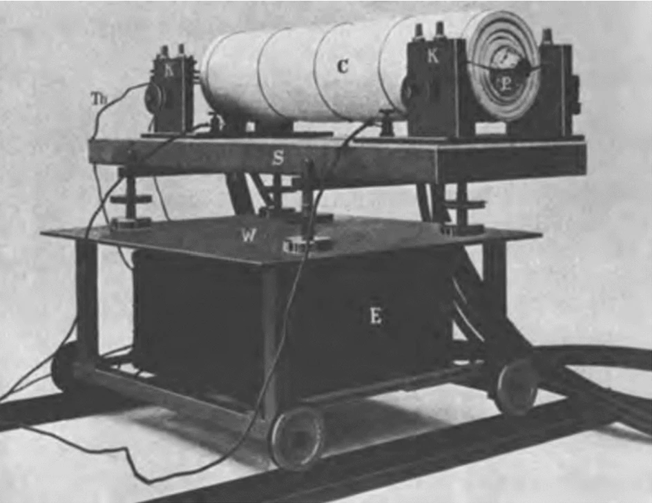 Continúan los ensayos, y se pasa de una cavidad esférica, como la empleada por Lummer y Pringsheim (1899), a una tubular como la de la Figura 2, un horno diseñado por Lummer y Kurlbaum (1901), que consiste en un tubo de porcelana con un dispositivo interior de calentamiento eléctrico, recubierto con una mezcla de óxidos de cromo, níquel y cobalto, y calentado externamente por un cilindro de platino.