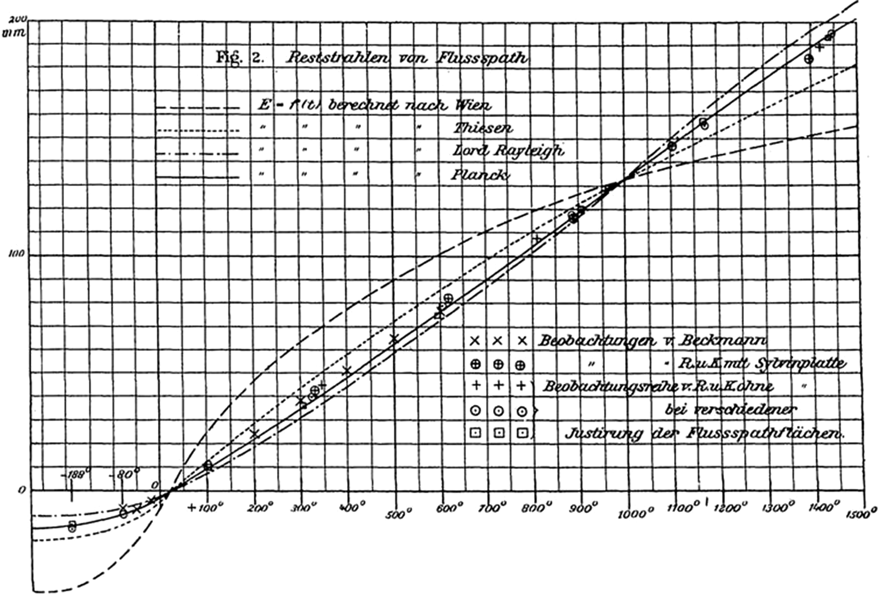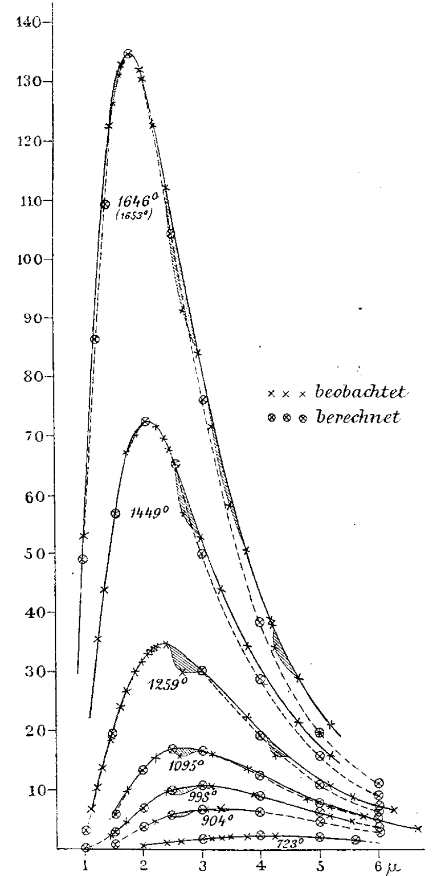 En 1899 Lummer y Pringsheim (1899) presentan ante la Sociedad Alemana de La Física los Distribución de energía en el espectro del cuerpo negro, donde demuestran sistemáticamente que la ecuación de Wien no describe correctamente la radiación para longitudes de onda grandes (λT > 3000), como se puede observar en la Figura 1. En la presentación de Comentarios críticos sobre la radiación del cuerpo negro (Lummer y Pringsheim 1900), llevada a cabo por Lummer el 2 de febrero de 1900 en la Sociedad Alemana de la Física, propone una nueva ,