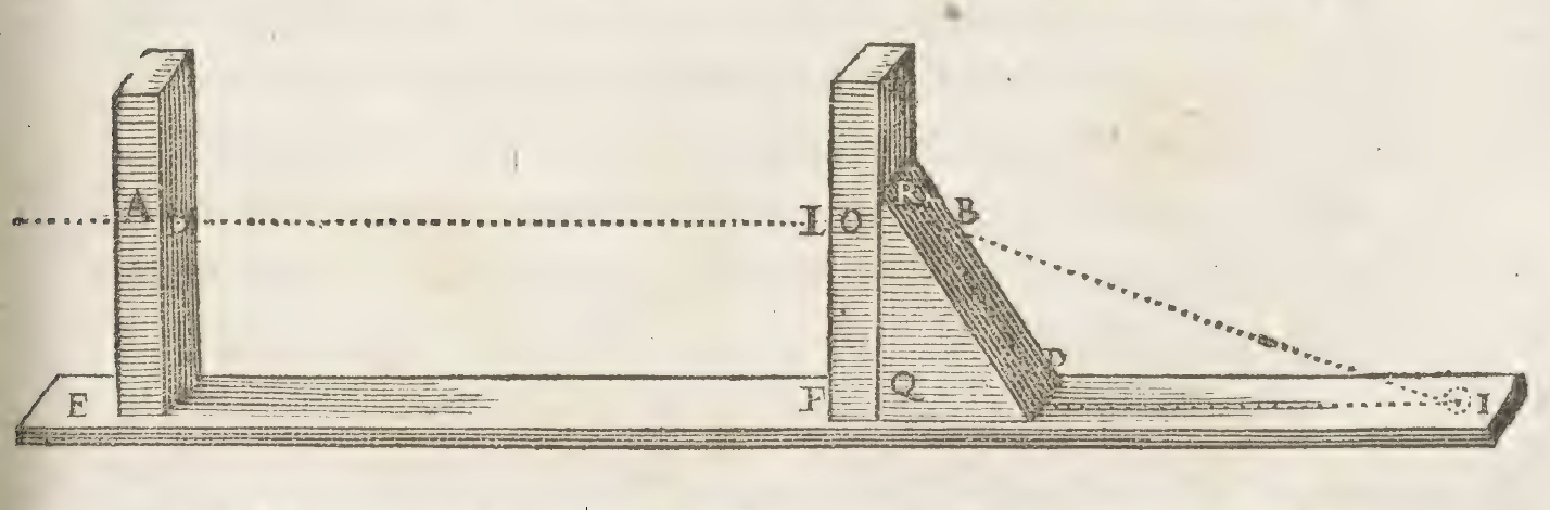 Para estudiar la refracción de la luz utilizó un vidrio con forma de prisma (triangular o en forma de cuña) para su determinación precisa del índice de refracción del vidrio, como se puede observar en la Figura 1. El ensayo consiste en hacer pasar un fino haz de luz mediante los agujeros $A$ y $L$, a través de dos puntales de madera montados en $E$ y $F$, y que «choque» contra el prisma apoyado contra el segundo puntal sobra la cara $\overline{QR}$ y comprobar la refracción del haz a lo largo de la línea $\overline{BI}$. Análogamente al descubrimiento de la refracción por parte de Willebrord Snel y de forma independiente, dedujo geométricamente que cuanto mayor sea el índice de refracción, menor será la distancia $\overline{PI}$ (Hentschel 2002):
